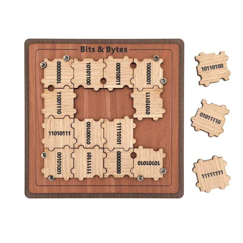Bits & Bytes es el rompecabezas definitivo para cualquier aficionado a la informática. El rompecabezas consta de 16 bytes (piezas), y cada byte tiene 8 bits (un "0" para una muesca y un "1" para un reborde). El objetivo es construir un cuadrado con los 16 bytes (piezas) que encaje en el marco. ¡Un reto realmente difícil!