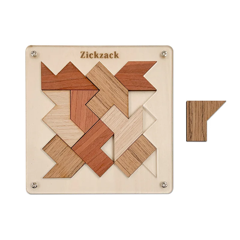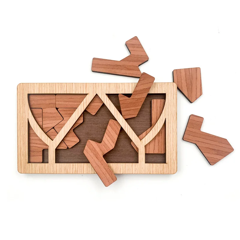 El rompecabezas de 6 piezas es un clásico rompecabezas de colocación o estilo tangram. Al retirar las piezas, verás diferentes tareas dentro del marco.